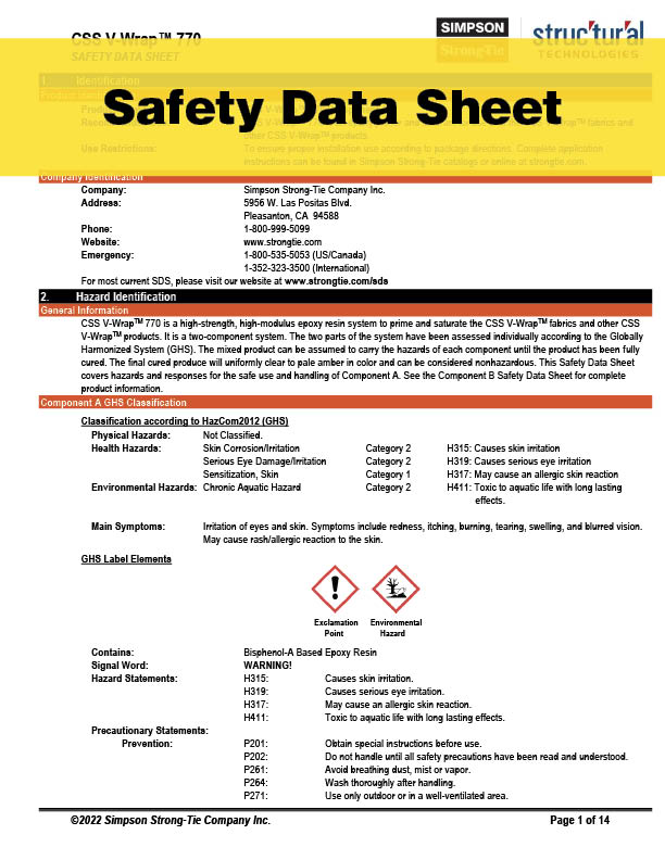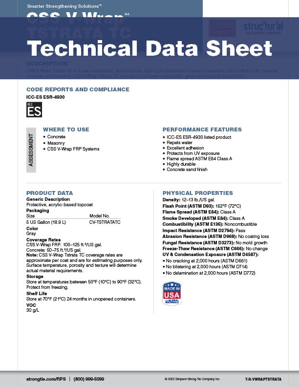 CSS-ES is a two-component, high-strength, high-modulus epoxy resin system used to prime substrates and saturate the Simpson Strong-Tie® Composite Strengthening Systems (CSS) fabrics. When extended with fumed silica, thickened CSS-ES is used as a high-performance substrate repair material and CSS finish coating. This product has been evaluated per ICC-ES AC125 for concrete and unreinforced masonry strengthening using externally bonded fiber-reinforced polymer (FRP) composite systems. This product is NSF-listed safe for potable water. Please refer to the NSF listing for the NSF 61–listed application. This product is part of the tested assembly in UL Design No. N861, which achieved a four-hour fire rating when subjected to ASTM E119 / UL 263 full-scale fire testing. Please refer to UL Online Certifications Directory for the UL listing.