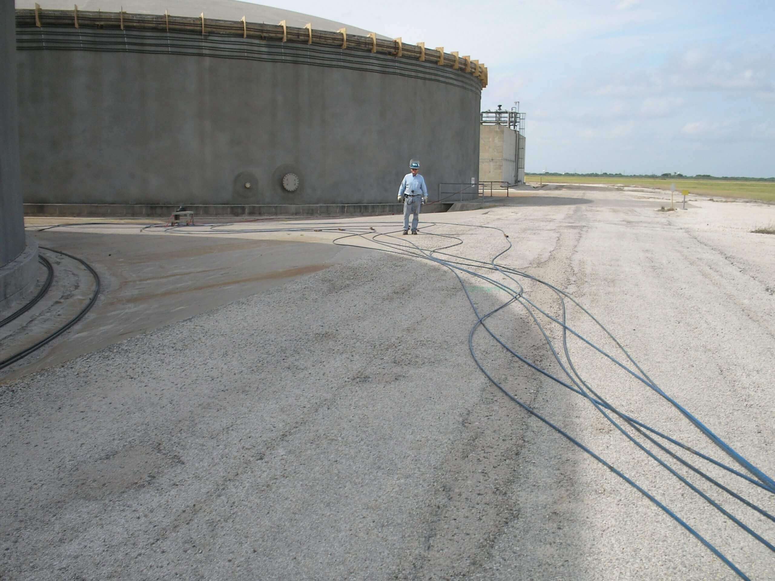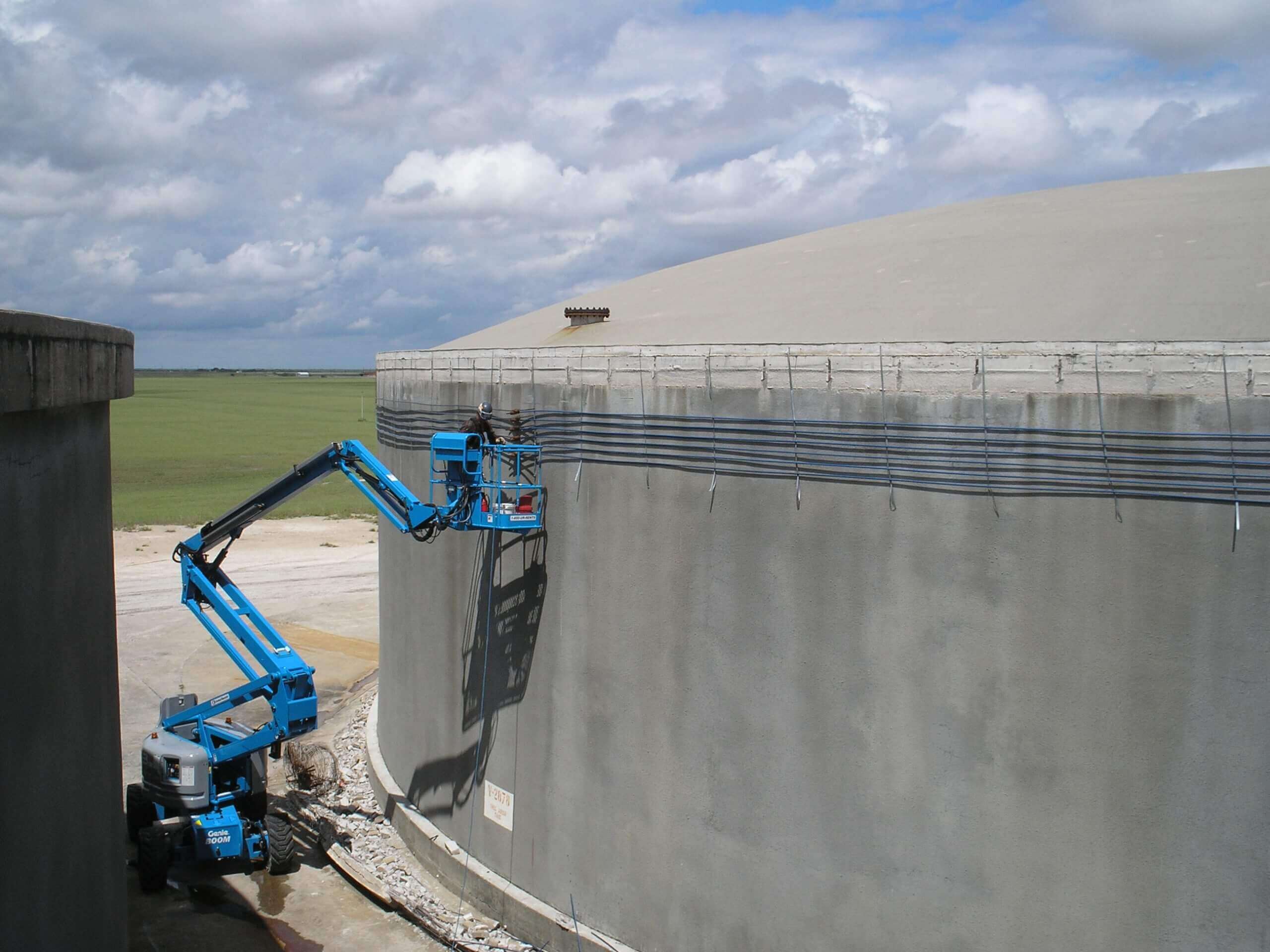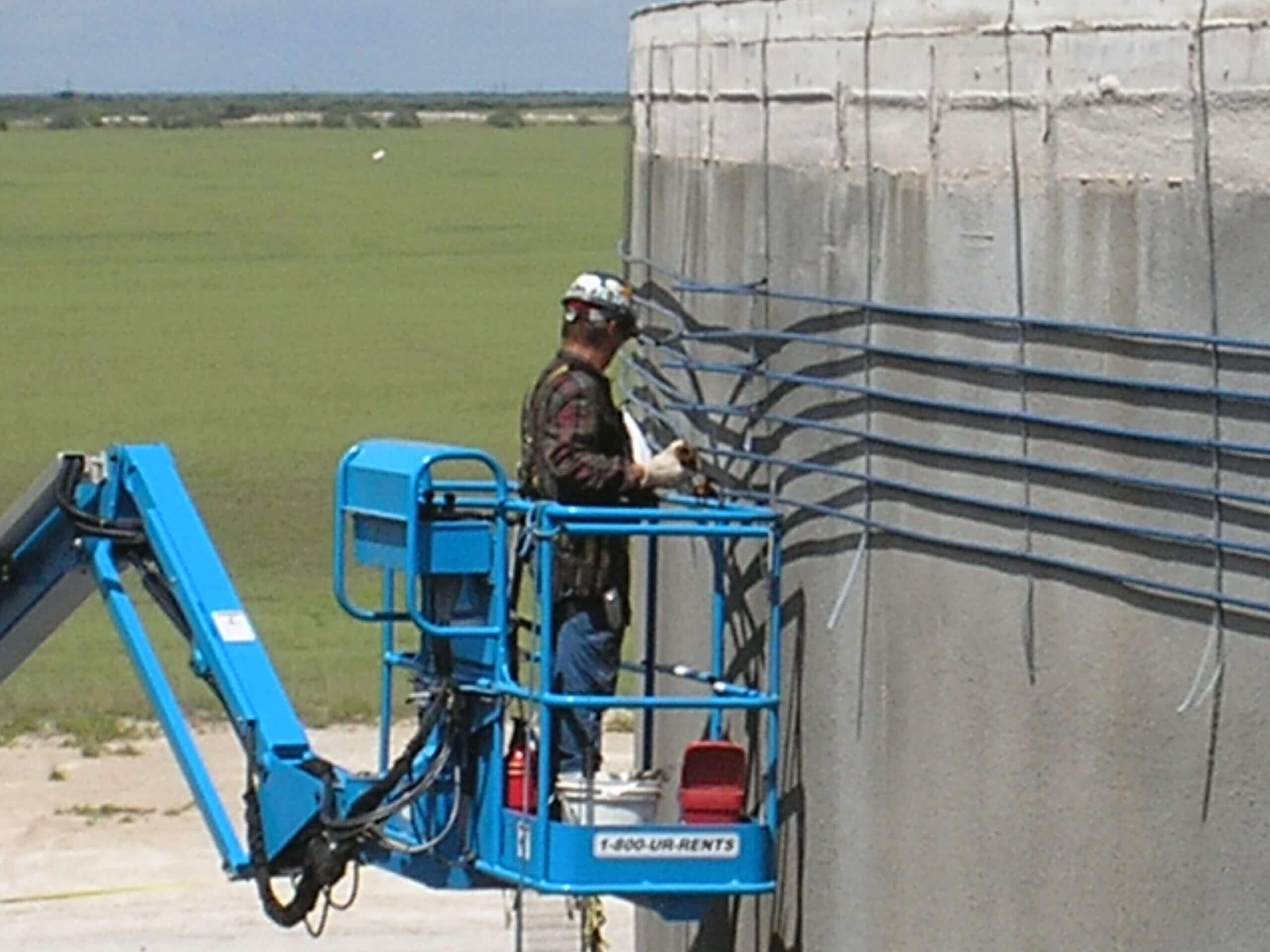 The Celanese Bishop Chemical Plant (Bishop, TX) is home to three rainwater treatment tanks – two measuring 150 feet in diameter and one measuring 122 feet. All three wire-wrapped concrete tanks were built in 1992. When a wire-wrapped ring beam corroded and failed on one of the tanks, it required repair in order for the tank to remain operational.
