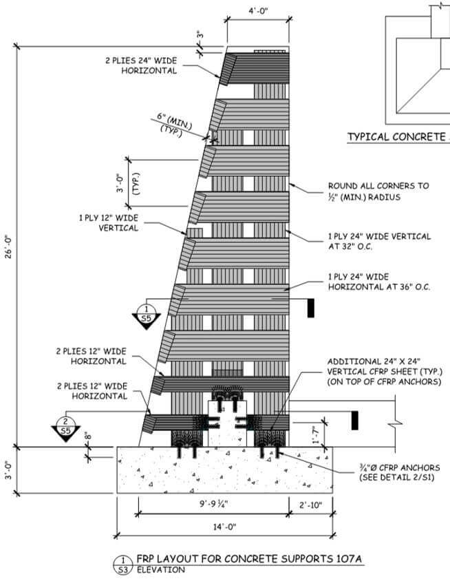 The towers were surveyed and monitored to track any movement or width changes in the cracking for several months. Additional concrete material testing, including petrographic analysis for Alkaiai-Silica Reaction (ASR) and Uranyl Acetate Reagent solution testing was also conducted. The structural evaluation report revealed that although the existing structure components had adequate strength to support the towers’ design loads, the discovered cracks were moving and propagating, and the effects of the external loads had also weakened the columns. It was determined that the best, and most cost-effective, solution was to repair the cracks by injecting them with epoxy, then strengthen the tower column supports using Tstrata’ V-Wrap™ C400H high-strength carbon fiber fabric and its V-Wrap™ Carbon FRP Rod.