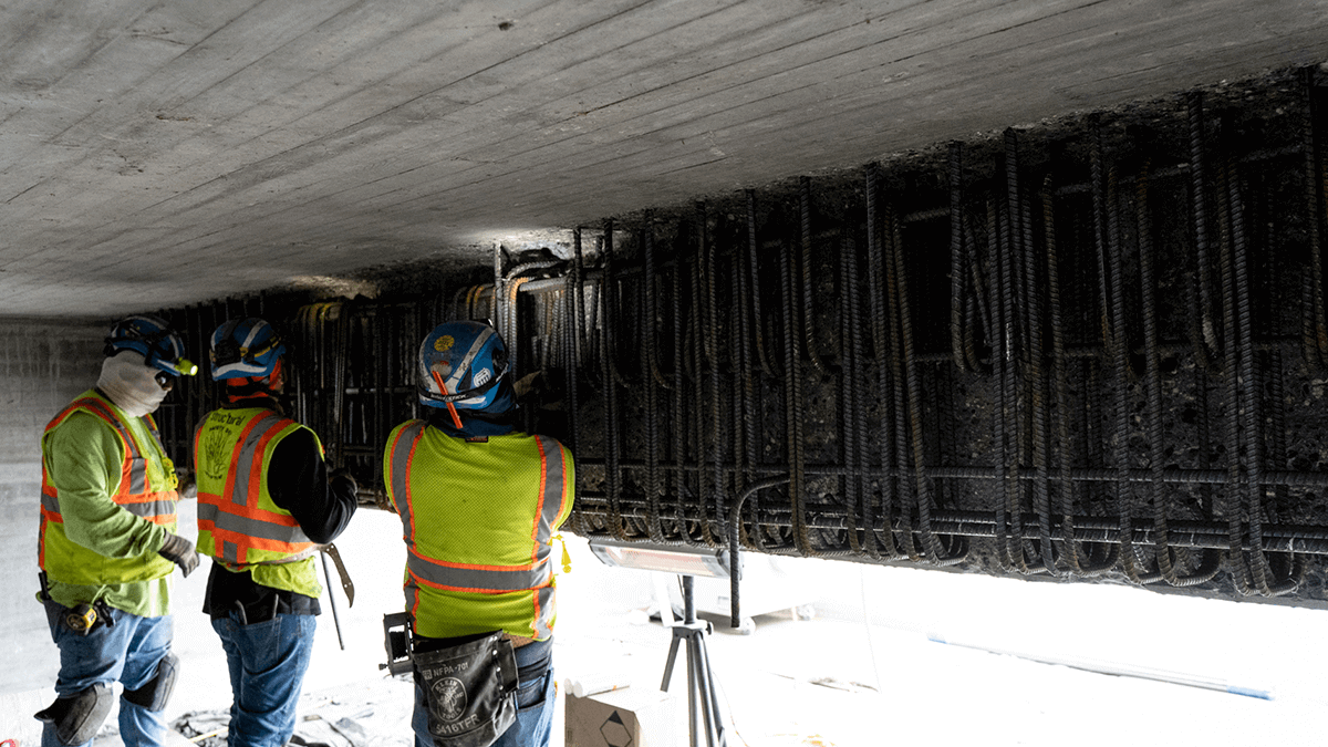 Once the site was prepped, the team drilled holes for epoxy dowels and used electric chipping guns to prepare the existing concrete beam surfaces. Reinforcing steel was installed along with formwork and the concrete was pumped. The access platforms were removed once the repairs were complete.