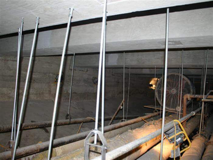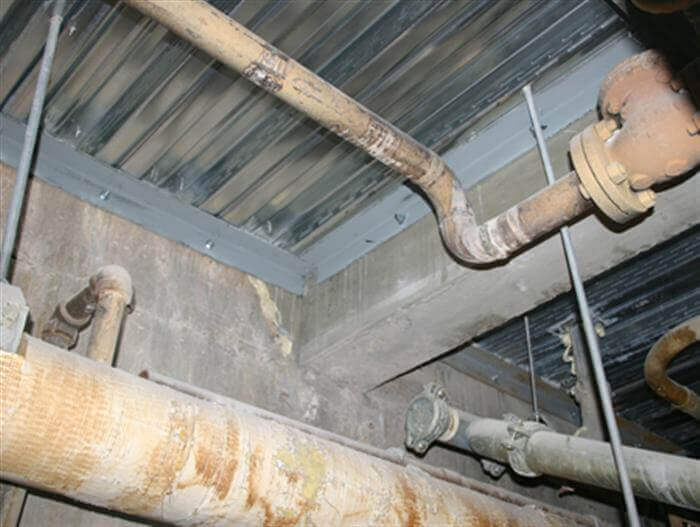 Repairing the below sea-level room that contained the GRU proved to be a challenge. The concrete ceiling and three very large columns in the room had deteriorated to a point of structural concern. Once the original ceiling structure was removed, formwork was placed and a new two-way slab and beam system was cast with new hangers and supports for the piping and the equipment. Reinforced enlarged sections were added to repair and strengthen the columns.