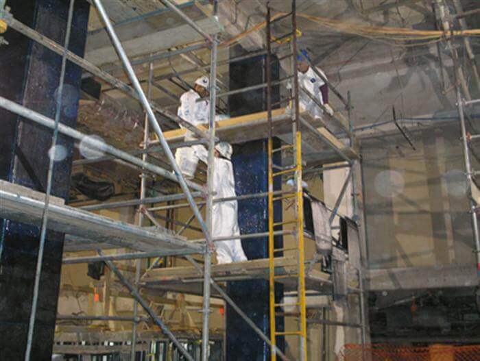 Traditional methods for strengthening columns involve steel and concrete in the form of an enlarged external jacket around the column. This method must be performed monolithically with the column to provide resistance to higher buckling forces and in this case would have increased the overall column size – making the egress width of the new corridor below code. Instead, the team chose to use CFRP – bonding it to the columns with epoxy adhesive in both horizontal hoop and continuous vertical sheets. While adding less than one inch to the column size, they effectively upgrade the column for both buckling and current load carrying capacity codes.