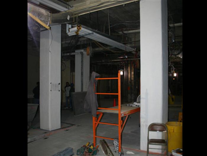 Creating this connection was the final phase of the project, but it presented unique challenges. Because the two towers were at different elevations, it was necessary to build the concourse on an incline. Building on the incline, however, meant that the existing intermediate slab had to be removed in order for the concourse to pass through the lower elevation to the higher one. The removal would double the unsupported length and could cause the columns supporting the original building loads to buckle. The columns, as well as two other areas, a steam tunnel and the Grease Recovery Unit Room (GRU), also had to be repaired and/or strengthened before the new concourse could be completed.