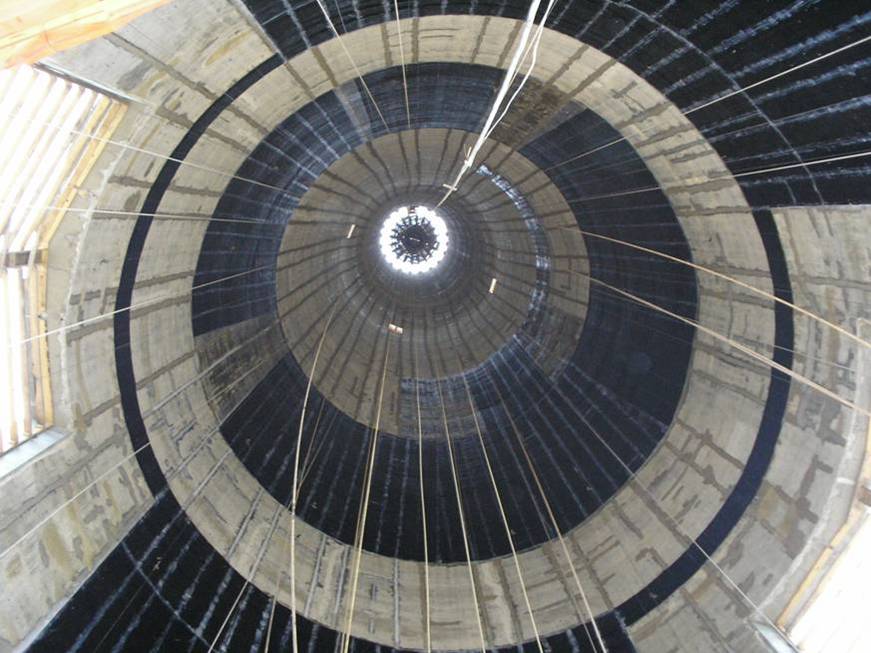 Tstrata was contacted to assist with the repair. Augmenting the engineering firm of record, Tstrata helped determine that a carbon fiber strengthening system, V-Wrap™, would provide sufficient reinforcement when used in conjunction with Tstrata™ Enlargement Systems that widened the base of the structure by 8 feet and the use of steel plates around the breach openings. Tstrata designed the use of these products and supplied the materials for the contractor, STRUCTURAL, to install and integrate into the structure’s final design. Last, a protective coating was applied to the structure’s interior and exterior.