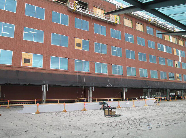 Prior to placement of concrete, reinforcement of the bonded overlay was performed on the transportation area deck. Window replacements were also made on the façade of the office building.