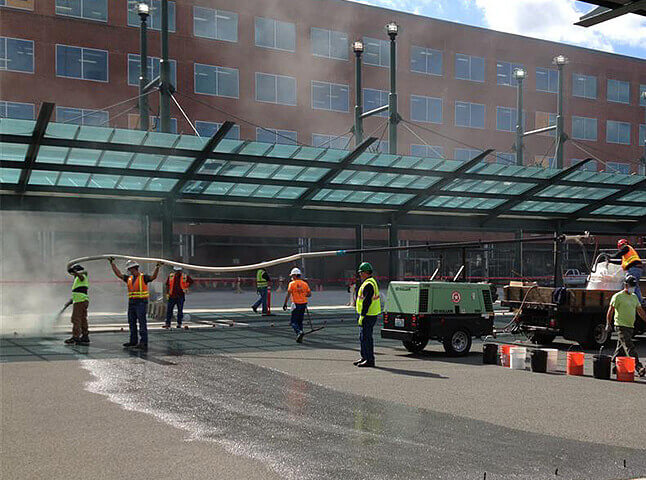 Crews apply a traffic-bearing coating in the public transportation area.