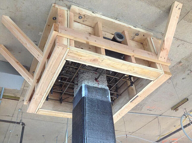 Tstrata™ Enlargement Systems formed to resist punching shear in slabs. Column wrapped with V-Wrap™ FRP Composite Strengthening System for axial strength.